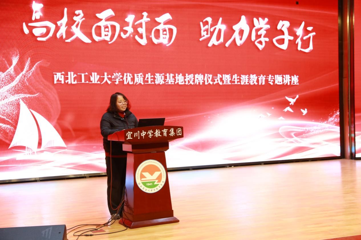 王莉代表学校向宜川中学赠送纪念品以终为始-职业规划筑梦前行为题,从点燃理想、追逐理想、实现理想三个方向介绍了生涯规划、能力培养、价值塑造等内容,分享了身边优秀学子的案例勉励同学们明确目标坚定信,找准自己的兴趣爱好,做好学科和专业规划行之有效的行动去实现梦想