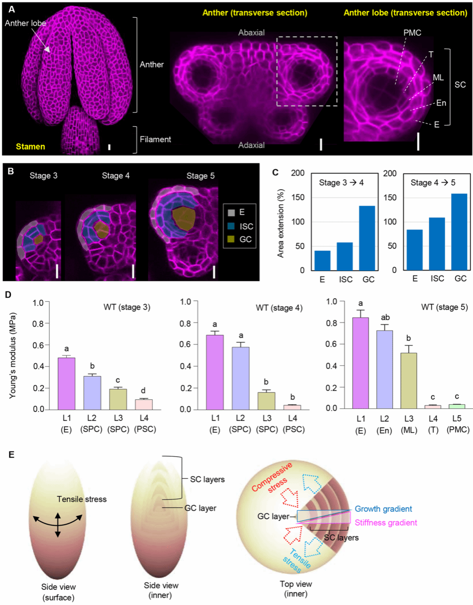 该研究中,研究者通过四维活体成像、原子力显微镜、布里渊显微镜等多种先进的力学测量与细胞生物学技术发现雄性生殖细胞诞生于一个特殊的力学微环境,即在花药发育早期,内部的生殖细胞相较于外层的体细胞具有更快的扩张速率和更柔软的细胞壁,从而在组织内部形成了一个由内向外、由软到硬的刚性梯度。这种生长和硬度的不均,导致快速生长的内部生殖细胞前体向外推挤,使其自身处于受压状态,而外层体细胞则承受张力,形成了“机械冲突”。