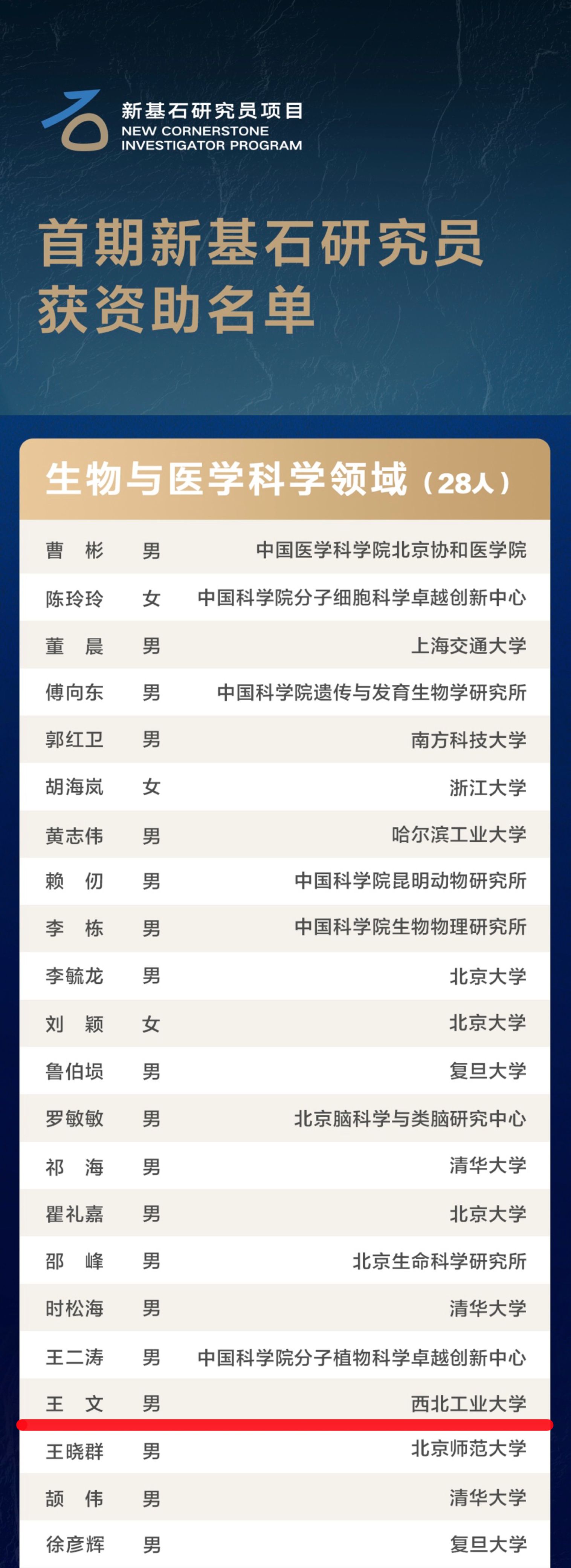 王文教授入选首期“新基石研究员项目”(生物与医学科学领域),全国共58人获得资助。