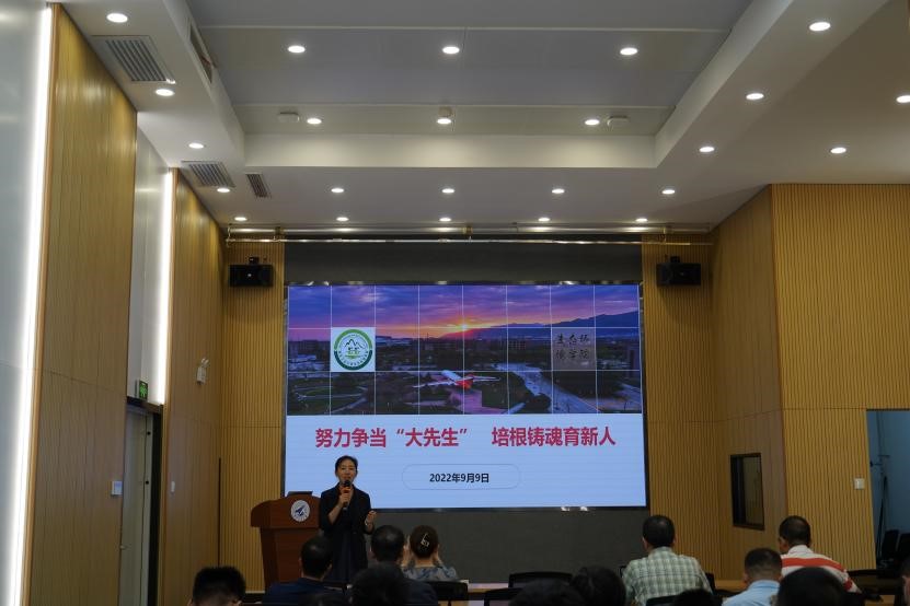 99日下午,在第38个教师节来临之际,为进一步加强师德师风建设,深入贯彻学校人才工作会议精神,弘扬科学家精神,团结凝聚广大教师以更加昂扬向上的精神风貌和立德树人的扎实行动迎接党的二十大胜利召开,电影大全 开展“师德师风建设月”活动,召开教师节座谈会暨师德师风建设专题报告会,学院领导班子和全体教职工参加了此次大会。会议由学院党总支书记、副院长牟蕾主持。