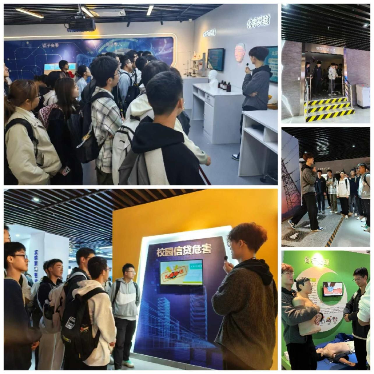 安全体验馆内设施齐全,模拟情景真实。在讲解员的引导下,同学们依次学习了自然灾难防护、实验安全、消防安全、网络安全、卫生安全等多个主题。在地震体验区,大家亲身感受了八级地震的震感并学习了在高压环境下的安全通行方法;在实验安全区,了解了各类实验室标识的含义及不同实验的操作注意事项;在消防火灾区,掌握了不同类型灭火器的适用场景与使用方法;在网络安全区,认识了校园信贷陷阱和常见电信诈骗手法;最让同学们受益匪浅的是急救知识区,大家积极参与,动手练习CPR和海姆立克急救法。