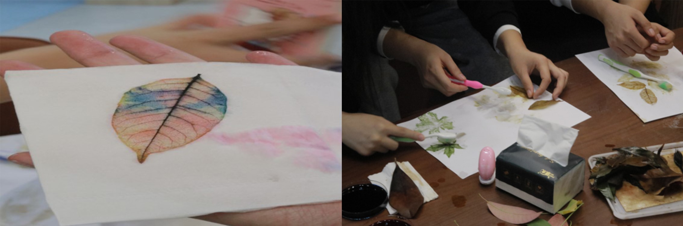 沙龙区开展,工作人员将处理好的落叶提供给参与活动的学生,刷除叶肉,进行染色、塑封和丝带装饰,制作完成叶脉书签,此阶段参与人数高达70余人。