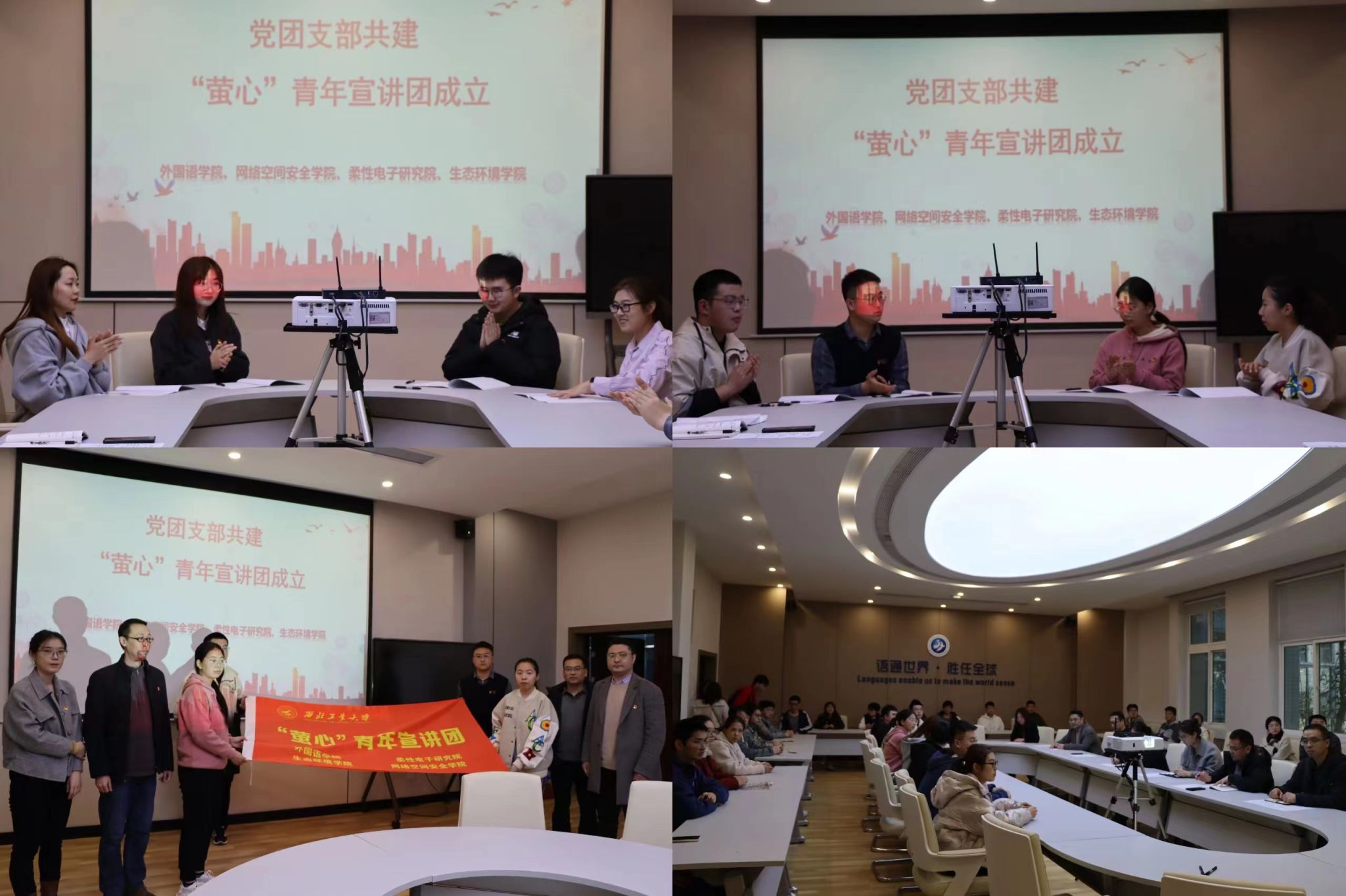 接着是四院学生宣讲团成立授旗仪式。为深入学习宣传贯彻党的二十大精神及习近平新时代中国特色社会主义思想,四院成立“萤心”青年宣讲团。外国语学院党委副书记马颖、网络空间安全学院党总支副书记禹亮,电影大全